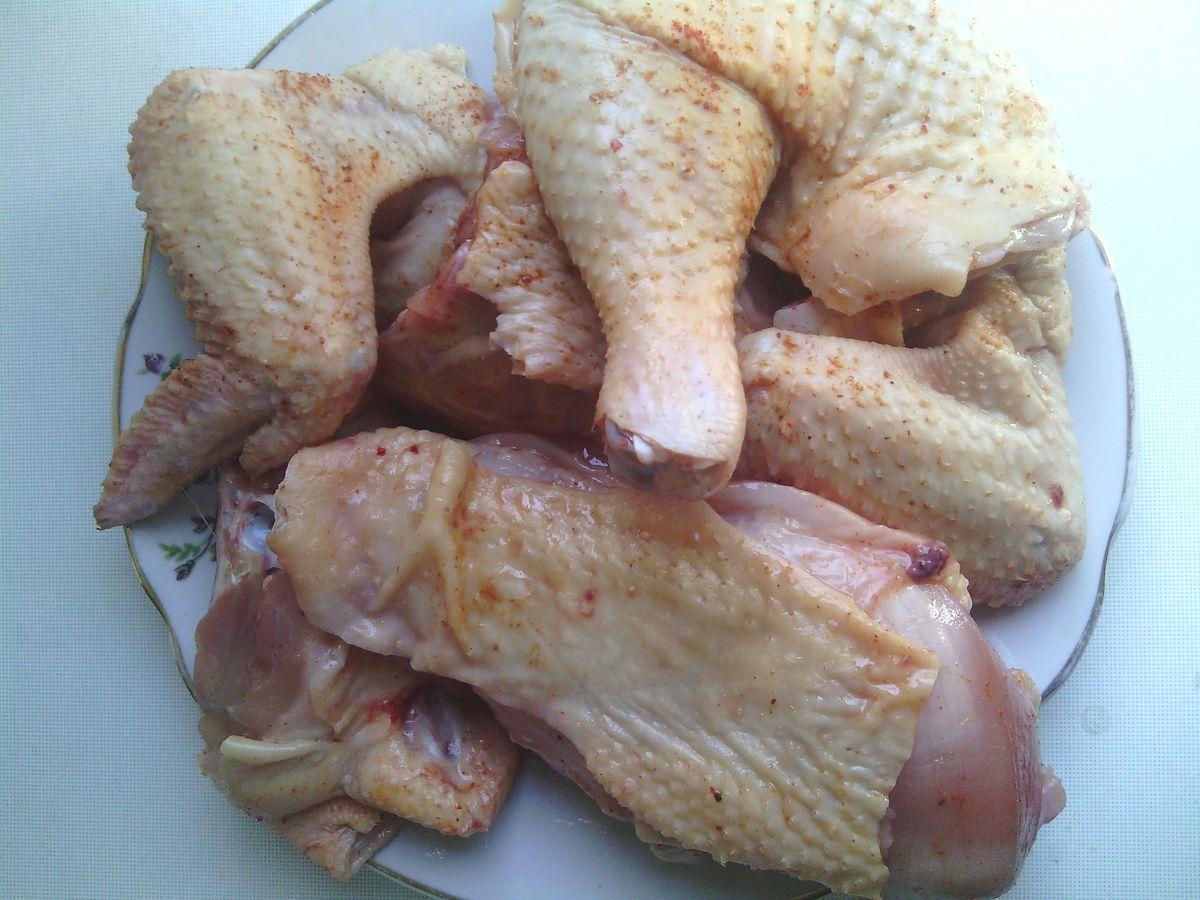 Ir pereikite prie maisto gaminimo. Vištieną supjaustykite gabalėliais, nuplaukite, nusausinkite, įberkite druskos ir pipirų. Kepkite iš visų pusių, kol iškeps.