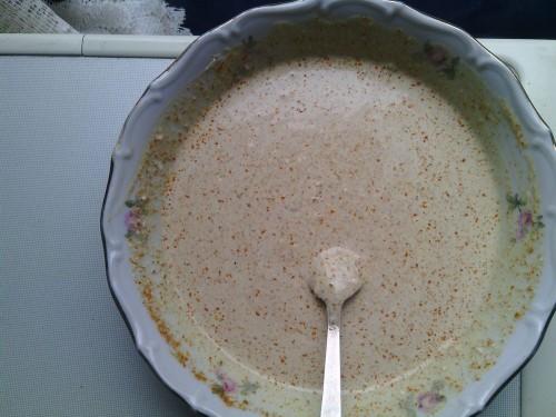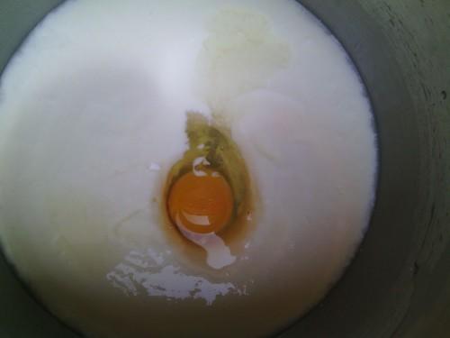 Į keptuvę supilkite jogurtą ar kefyrą, įpilkite vandens ir kiaušinį.