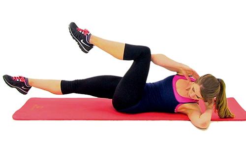 - Sulenkite kelius, kai dešinysis kulnas remiasi į kairįjį kelį. Kairę ranką uždėkite ant galinės galvos, o dešinę - ant klubo. Priveržkite abs ir ištieskite kairę alkūnę prie dešiniojo kelio. Pakartokite priešingai.