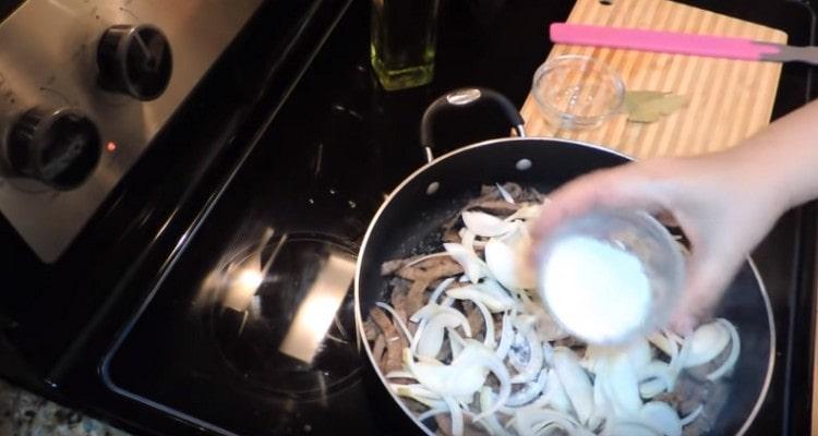 - Į keptą mėsą įpilkite druskos, juodųjų pipirų pagal skonį.