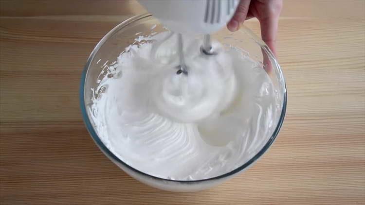 - Į nedidelį troškintuvą įpilkite karšto vandens, užvirkite vandenį, sumažinkite šilumą iki vidutinės. Ant troškintuvo viršaus uždėkite dubenį baltymų ir cukraus (puodelio skersmuo turėtų būti daug didesnis nei troškintuvo skersmuo). Dubenio turinį plakite mikseriu minimaliu apsisukimų per minutę greičiu. Maišytuvo šluotelė turi būti sausa, be riebalų (nuvalykite juos alkoholiu ar degtine).