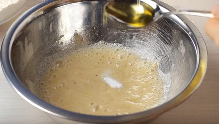 - Į gautą tešlą įpilkite augalinio aliejaus.