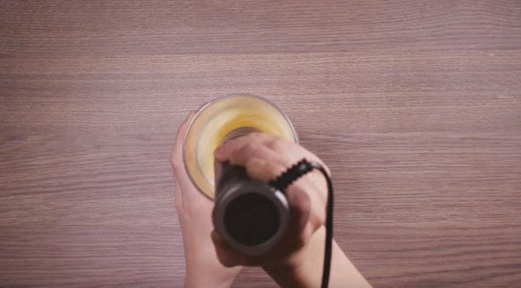 - Atskirame dubenyje muškite kiaušinius, palaipsniui įpildami šalto pieno.