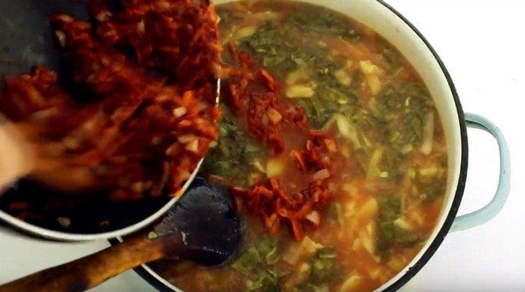 - Nuplauname 170 g soros po tekančiu vandeniu. Pašalinkite storus stiebus ir smulkiai sukapokite sorą. Mes siunčiame jį į keptuvę ir po virimo virkite barščius dar 10 minučių.