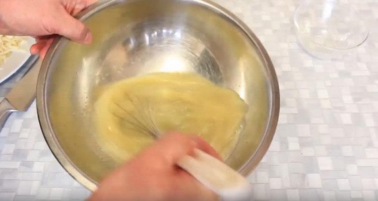 - Toliau plakdami supilkite 400–500 ml grietinėlės (pieno) į kiaušinių mišinį. Galite vartoti bet kokio riebumo grietinėlę, bet kuo riebesnė - tuo skanesnė.