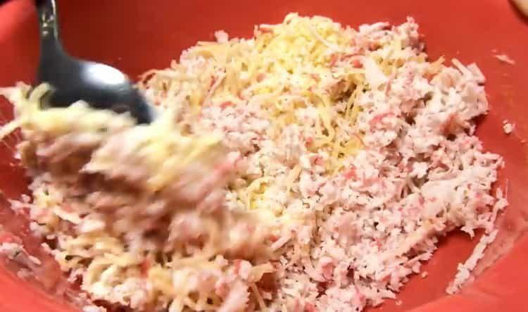 - 100 g kietojo sūrio taip pat sumalkite smulkia tarka. Krabų lazdeles ir sūrį sudėkite į gilų dubenį. Į tarkuotus ingredientus įpilkite apie 1 šaukštelį. prieskoniai savo nuožiūra. Norėdami gauti ypatingą eleganciją, galite naudoti džiovintas žoleles - raudonėlį, baziliką, rozmariną ir kt. Įpilkite 1 valg. Šaukšto įdaro. l majonezo bet kokio riebumo, kurį norite, ir gerai išmaišykite su šaukštu iki vientisos masės. Vietoj majonezo galite naudoti grietinę ar natūralų jogurtą.