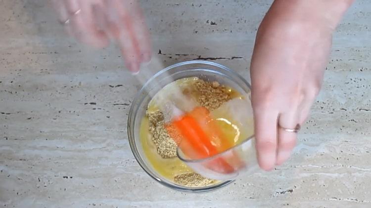 - Į dubenį susmulkintų sausainių įpilkite 100 gramų išlydyto sviesto. Gerai išmaišykite iki vientisos masės.