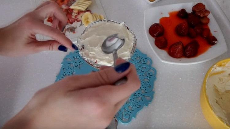 - Ant jo sluoksniuokite bananų sluoksnį, tada braškės.