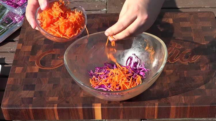 - Atskirame puodelyje smulkiai supjaustykite 100–120 g raudonųjų kopūstų.