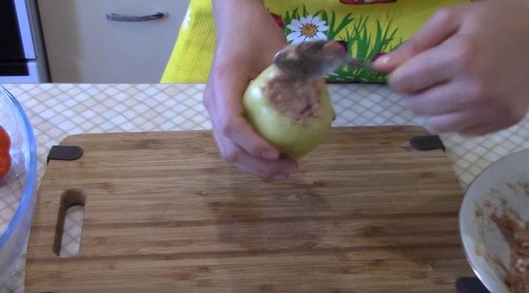 - Išdėliokite maltą mėsą ant paprikų. Nespauskite stipriai; virimo metu ryžiai padidės.