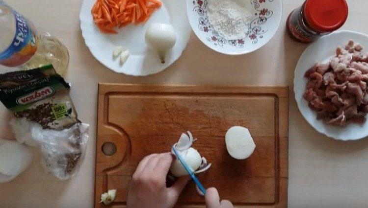 - Supjaustykite 100–120 g svogūnų į ketvirčio žiedus. Smulkiai supjaustykite 2 skilteles česnako.