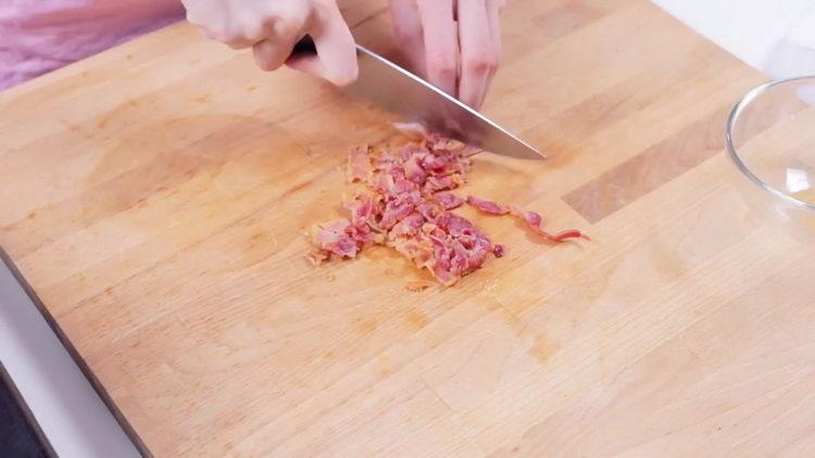 - Mes paruošime dešrainį su dviem skirtingais įdarais. Pirmasis gaminamas labiau amerikietišku stiliumi, tam prireiks 3–4 riekelių lašinių, kuriuos reikia gerai iškepti. Įkaitiname sausą keptuvę ir ant jos paskleidžiame lašinių gabaliukus. Kepkite iš abiejų pusių 2-3 minutes ant vidutinės ugnies. Šoninė turėtų tapti traški. Iš abiejų pusių keptus lašinius perkeliame ant plokščio indo, uždengto popieriniais rankšluosčiais. Paliekame lašiniui keletą sekundžių atsigulti, kad krūva būtų perteklinė. Atvėsus, kepta šoninė supjaustoma smulkiais gabalėliais.