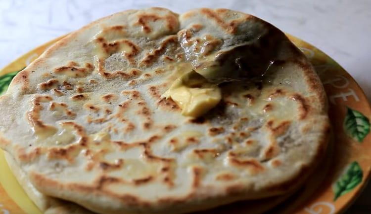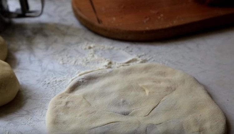 - Ant miltais pabarstyto stalo švelniai minkykite pirštais ir ištieskite tešlos rutulį kartu su įdaru, kad jis taptų tortilijos - hitchina. Tai reikia padaryti labai atsargiai, kad tešla nesulūžtų. Galite naudoti riedėjimo kaištį.