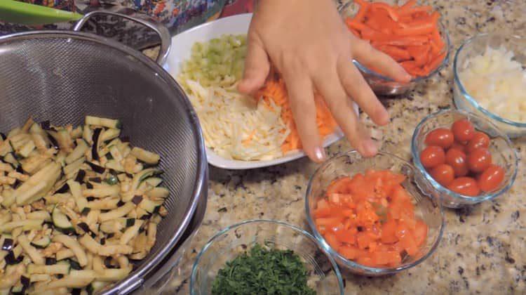 - Bulgarijos pipirai nulupami iš sėklų ir kotelio, o tada supjaustomi tokio paties dydžio juostelėmis kaip baklažanas.