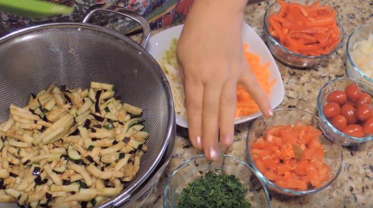 - Supjaustytus produktus mes perkeliame į kiaurasamtį, kurį dedame ant keptuvės. Pabarstykite daržoves 20–30 g druskos, išmaišykite ir palikite tokią formą 2 valandoms, kad atsikratytų kartumo ir sulčių pertekliaus.