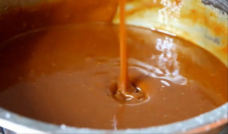 - Ištirpinkite antrąją miltelių dalį, įpilkite dar 160 g ir taip pat ištirpinkite. Įkaitinkite kompoziciją iki 180 laipsnių ir išjunkite šilumą. Tada į savo karamelę įpilkite grietinėlės ir jas ištirpinkite.