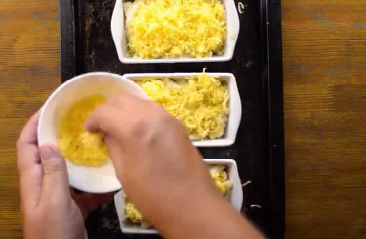 - 100 gramų olandiško sūrio sutarkuokite ant rupios tarkos. Sūrį padalinkite iš formų skaičiaus. Pabarstykite kalmarus sūriu.