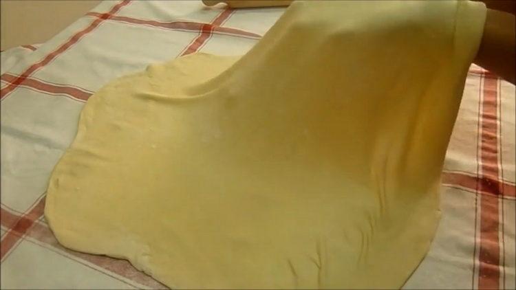 - Viską gerai išmaišykite ir atidėkite. Po 30 minučių išimame tešlą iš šaldytuvo. Darbinį paviršių padengiame staltiese arba audinio gabalėliu, pagamintu iš natūralios medžiagos. Švelniai apibarstykite miltus. Tešlą supilame ant miltų ir kiek įmanoma iškočiojame, naudodamiesi riedėjimo kaiščiu.