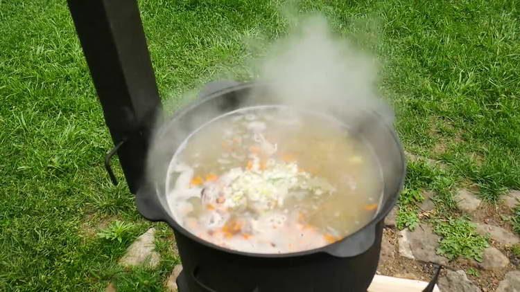 - Mes montuojame ir uždegame kepsninę, jei gaminame ausį gamtoje. Įstatome katilą ir į jį supilame 7 litrus švaraus geriamojo vandens.