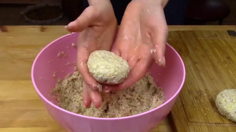 - Norėdami kotletų masę palaikyti dar 10 minučių, kad dribsniai sugertų daržovių sultis. Drėgnomis rankomis suformuokite kotletus iš kotletų masės.