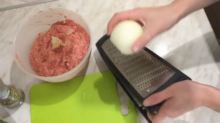 - Mes paimame svogūnus (1 vnt.), Nulupkite, nuplaukite po tekančiu vandeniu. Mes imame trintuvę daržovėms, tris svogūnus ant smulkios trintuvės, turėtume gauti svogūnų košę, iš kurios reikia išpilti svogūnų perteklių sultis, mums to nereikia.