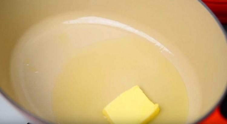 - Giliame ketaus inde ar keptuvėje su storu dugnu gerai pašildome 15 - 20 ml alyvuogių aliejaus ir 20 g sviesto.