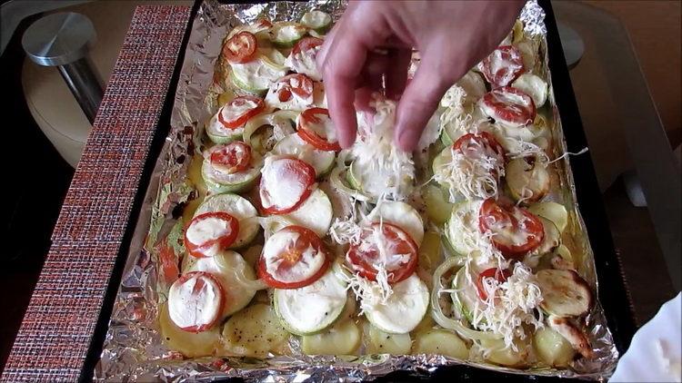 - Nulupkite ir nuplaukite maždaug 5-6 vidutines bulves. Nuplaukite dvi cukinijas po tekančiu vandeniu ir nusausinkite. Nuplaukite 1 saldųjį papriką ir 3 pomidorus. Cukinijos supjaustomos maždaug 4-5 milimetrų storio griežinėliais.