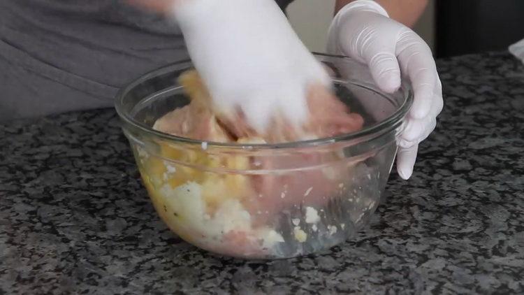 - Į maltą mėsą įpilkite svogūno ir česnako. Ten pridedame kiaušinį ir iš pieno išspaustą duoną.
