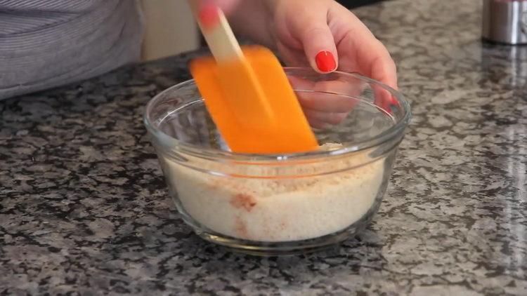 - Sutepkite formą augaliniu aliejumi. Į duonos trupinius įpilkite sauso česnako ir paprikos. Sumaišykite.