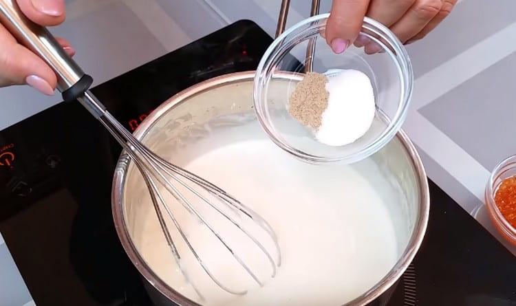 - Tada lėtai ir palaipsniui supilkite 400 g grietinėlės į troškintuvą, visą laiką maišykite mišinį su šluotele, kad padažas nesudegtų ir neliktų gabalėlių.