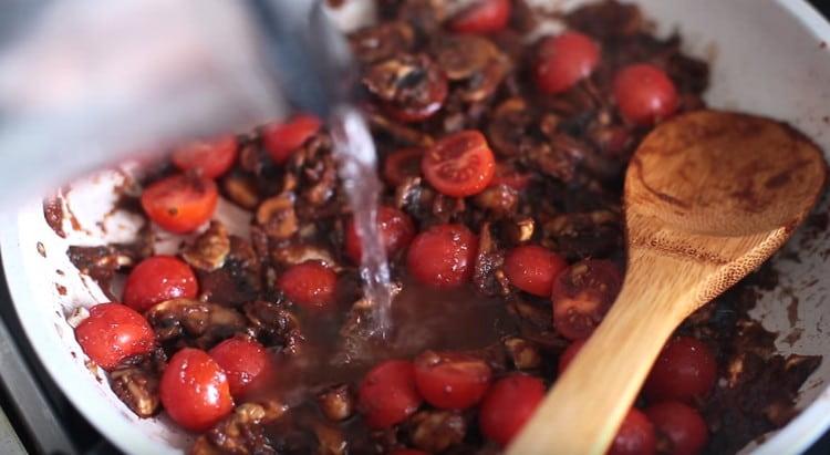 - Visus produktus sumaišykite keptuvėje, pašildykite porą minučių ir sudėkite į juos pusę vyšninių pomidorų.