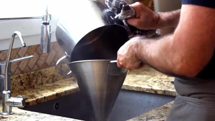 - Karštas vanduo, paimtas iš keptuvės, pridedamas prie pastos, kad padažas būtų praskiestas iki skystesnės konsistencijos.