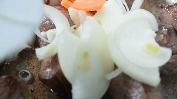 - Įpilkite mėsos su svogūnais ir morkomis. Pačioje pabaigoje pridėkite pipirų ir pomidorų. Kepkite 3 minutes.