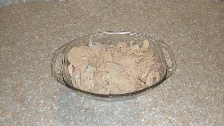 - Supilkite padažą su žuvimi ir svogūnais. Pirmiausia kiekvieną ešerio skerdeną galite padengti padažu, tada įdėti svogūną ir sutepti padažu. Padažas pasirodo labai skanus, jis suteiks gatavam patiekalui pikantiško skonio, todėl nebijokite jo įpilti daug. Patartina kepimo indą uždengti švariu rankšluosčiu ir palikti žuvis marinuoti padaže 10-20 minučių. Bet jei senėjimui nėra laiko, galite nedelsdami nusiųsti į orkaitę. Įjunkite orkaitę 180 laipsnių, nusiųskite į ją žuvį, kepkite 50 minučių. Kiekvienas kepimo laikas gali būti skirtingas, tai priklauso nuo orkaitės savybių. Todėl po 40 minučių galite patikrinti žuvies pasirengimą.