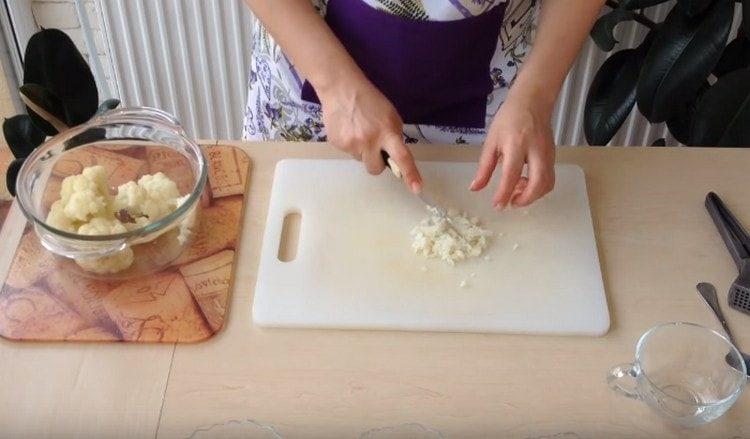 - Nulupkite vieną skiltelę česnako, nuplaukite po čiaupu, per spaudą tiesiai į žiedinių kopūstų ir miltų dubenį.