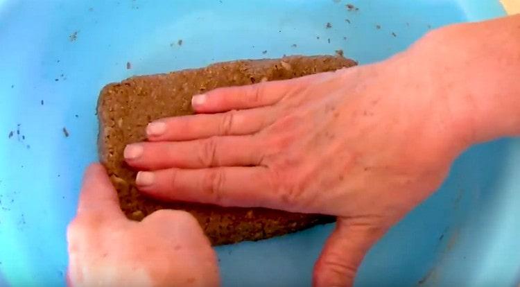 - Laikas minkyti tešlą. Jis sumaišomas labai paprastai, be pastangų. Jei visi ingredientai prilimpa - tai viskas, tešla padaryta! Mes suteikiame bandymui bet kurią norimą formą - plytą, apskritimą, juostą ir kt.