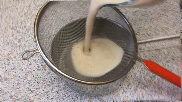 - Uždenkite indus arba priveržkite lipnia plėvele ir palikite išsipūsti 6-8 valandas. Praėjus mažiausiai 6 valandoms, gerai išmaišykite ir išmeskite masę ant sieto, uždėto ant nedidelio puodelio.