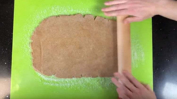 - Pasibaigus šiam laikui, mes išimame tešlą, iškočiodami iš jos stačiakampį sluoksnį, naudodami riedėjimo kaištį.