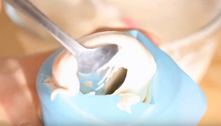 - Mes perkeliame tešlą į kepimo maišą, kad ji atsikratytų. Krepšį galima naudoti su garbanotais antgaliais arba be jų. Jei maišo nėra, galite naudoti šaukštelį.