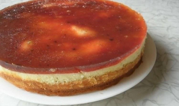 - Tešlą dėkite į įkaitintą iki 180 ° orkaitę ir kepkite iki auksinės rudos spalvos. Tortą šiek tiek atvėsinkite.