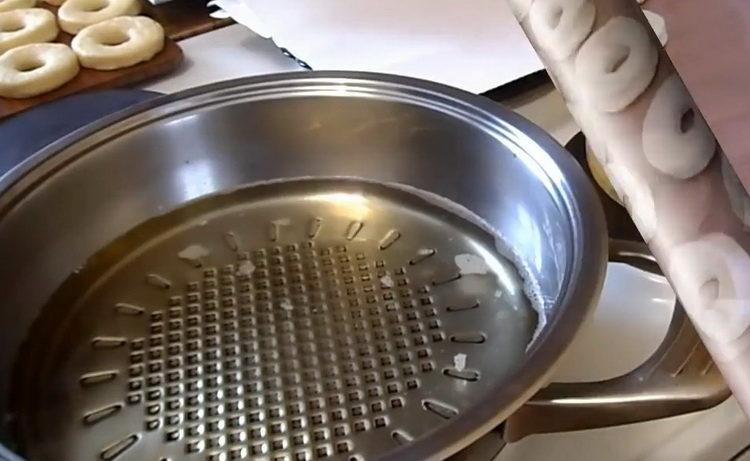 - Kai aliejus bus pakankamai karštas, gautus žiedus sudėkite į mažas dalis.
