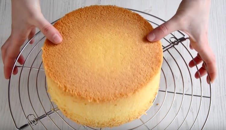 - Paruoštą biskvitą leiskite šiek tiek atvėsti pagal formą, po kurio jį galima išimti ir visiškai atvėsinti ant vielos stovo.