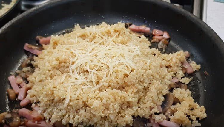 - Kai kvinoa bus paruošta, supilkite košę į virimo grybus.