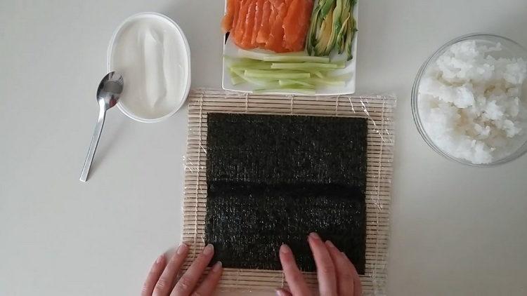 - Tada švelniai pasukite norimą lapą su ryžiais žemyn. Lapo viduryje paskirstykite Filadelfijos sūrį, o tada ant jo dėkite supjaustytą agurką ir avokadą. Nereikėtų iškloti per daug padažų, nes tokiu atveju ritinys nesuklys taip, kaip turėtų.