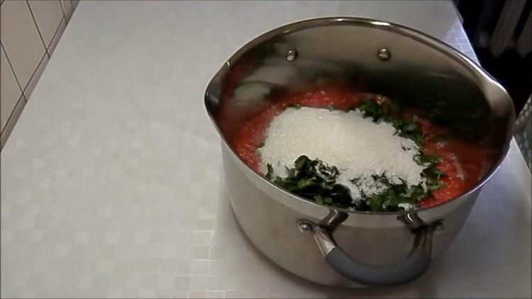 - Smulkiai supjaustykite didelę petražolių krūvą ir suberkite į keptuvę. Į keptuvę supilkite druską (50 gramų) ir cukrų (150 gramų). Supilkite augalinį aliejų (300 ml). Viską gerai išmaišykite ir uždenkite ant nedidelės ugnies, kad keptuvės turinys užvirtų, kol ruošite daržoves.