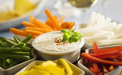 - Krevetės ir kiti ingredientai dedami į lėkštę atskirais segmentais. Į centrą įdėkite puodą su Dijon garstyčiomis.