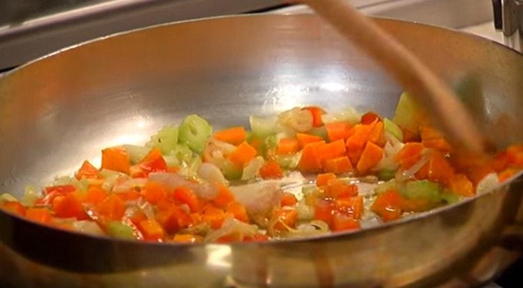 - Pirmiausia į keptuvę siunčiame svogūnus, salierus, česnakus ir pakepiname, retkarčiais pamaišome.