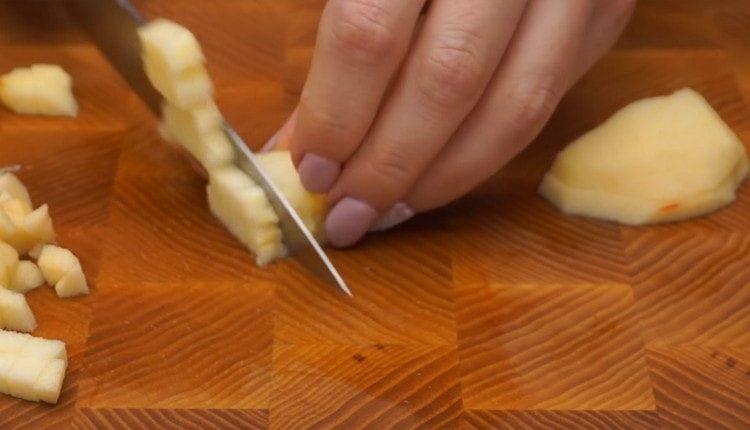 - Supjaustykite 300 g kumpio į mažus kubelius.