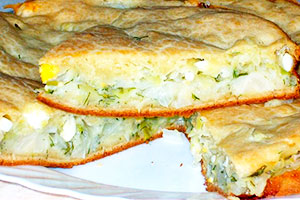 - Dėkite įdarą, išlyginkite, ant viršaus uždėkite likusią tešlos dalį.