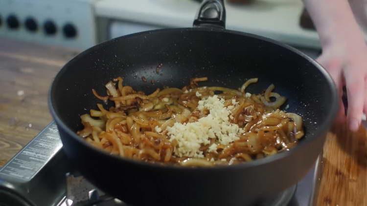 - 3–4 galvas česnako perpilkite per spaudą ir suberkite į svogūną. Viską sumaišykite.